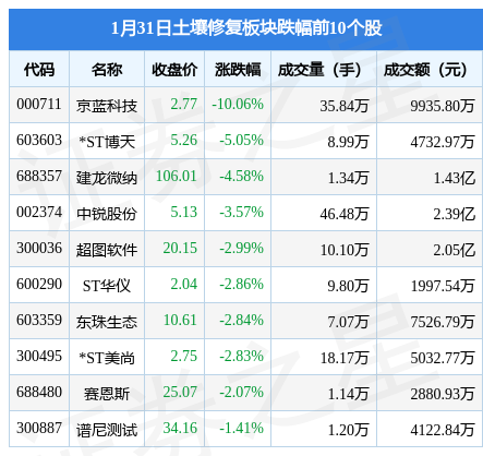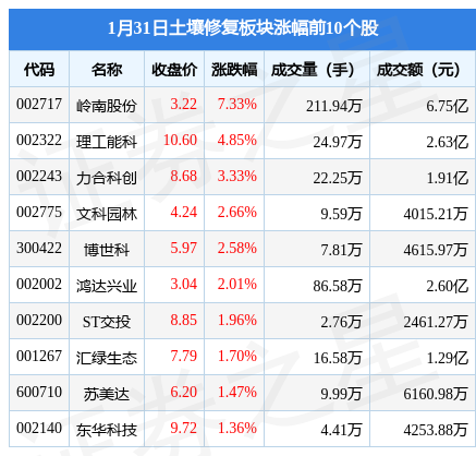 1月31日土壤修复板块较上一交易日上涨0.04%,岭南股份(002717)领涨。当日上证指数报收于3255.67,下跌0.42%。深证成指报收于12001.26,下跌0.8%。土壤修复板块个股涨跌见下表: