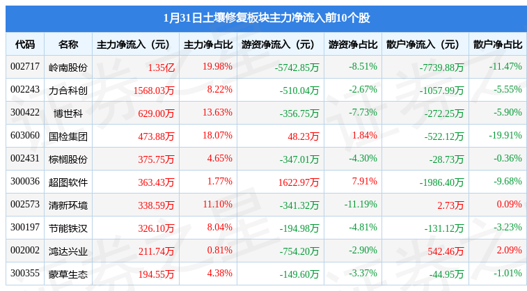 从资金流向上来看,当日土壤修复板块主力资金净流出7653.12万元,游资资金净流出1.01亿元,散户资金净流入1.77亿元。土壤修复板块个股资金流向见下表:
