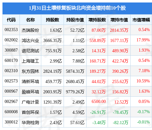 北向资金方面,当日土壤修复板块北向资金持股市值为135.35亿元,增持0.53亿元。其中增持最多的是杰瑞股份(002353),增持了0.28亿元。减持持最多的是力合科创,减持了531.35万元。土壤修复板块北向资金持股变动明细见下表: