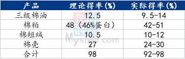 从上图中可以看出,毛棉籽由棉花脱绒得出,其下游产品分为:棉油、棉粕、棉短绒、棉壳四种产品。其中棉油主要用途为食用,在压榨过程中出油率可达9.5%-14%;棉短绒是棉籽剥绒后的产品,主要用于化纤工业当中得绒率10%-12%;棉粕是棉籽饼浸提残油后的产品,作为蛋白原料应用于饲料中,其出粕率42%-51%;棉壳是内陆地区主要用途为制作菌类培养基,种植蘑菇等食用菌类,新疆地区一部分棉壳用于饲喂牛羊,在剥壳中实际得率在24%-30%。