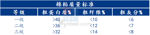 在国家标准GB10378-89中分为三级,三个等级中饲料用棉粕质量指标及分级标准以粗蛋白质、粗纤维、粗灰分为相关指标,参见下表: